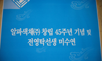 - (주) 알파색채 전영탁회장 미수연 및 (주) 알파색채 창립45주년 기념연이 11월19일 롯데호텔 크리스탈 볼룸(2층)에서 오후 6시부터 열렸다. 행사는 방송인 이상벽(홍익대 디자인 전공)씨 사회로 1.용산...