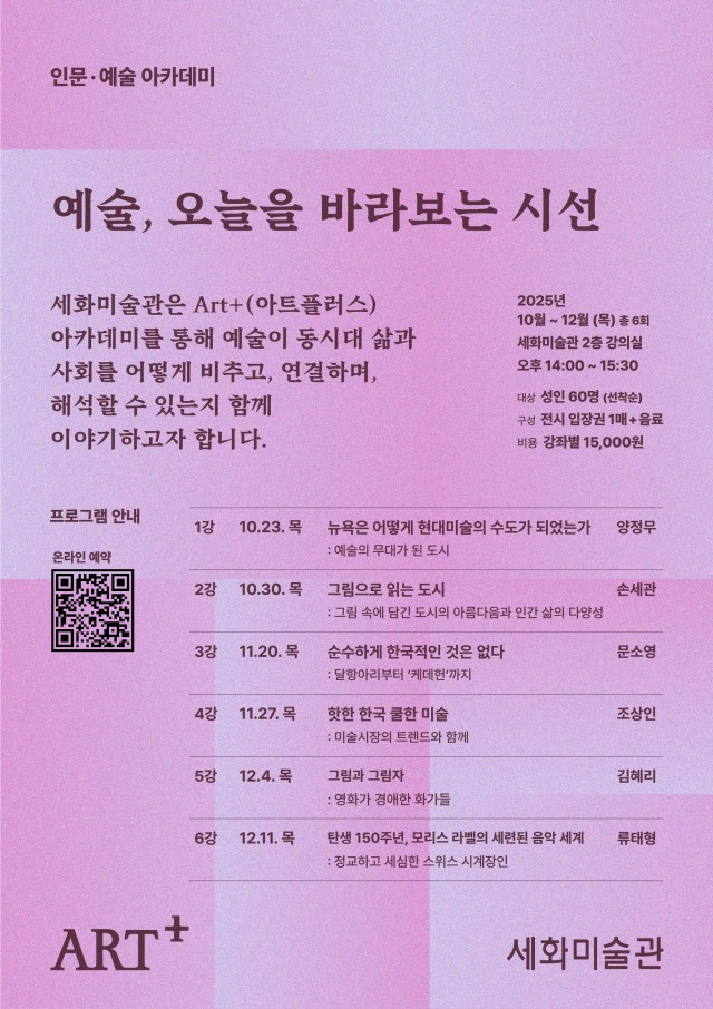 세화미술관은 ART+(아트플러스) 아카데미를 통해 예술이 동시대 삶과 사회를 어떻게 비추고, 연결하며, 해석할 수 있는지 함께 이야기하고자 합니다.