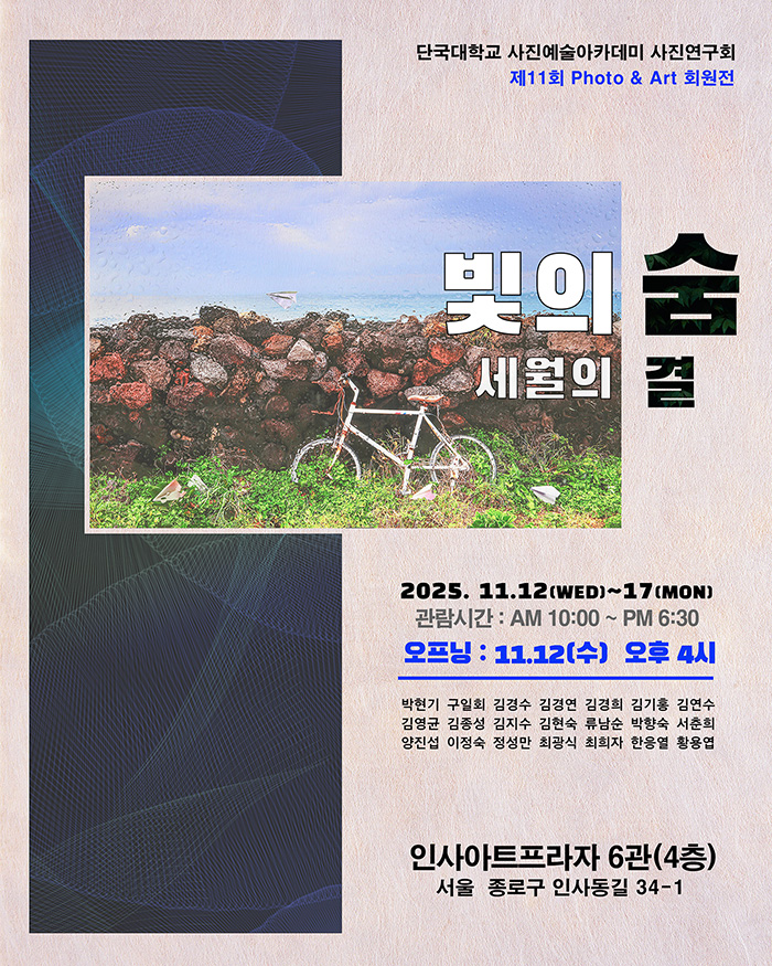 이번 전시는 ‘빛의 숨’을 따라가며, 그 안에 아로새겨진 세월의 결을 발견하는 자리입니다. 사진은 빛과 시간을 엮어 숨결을 남기고, 세월의 무늬를 새겨냅니다. 그 속에서 우리는 삶의 흐름과 기억의 결을 다시 바라보고, 결국 우리의 이야기를 이어가는 힘을 확인하게 될 것입니다.