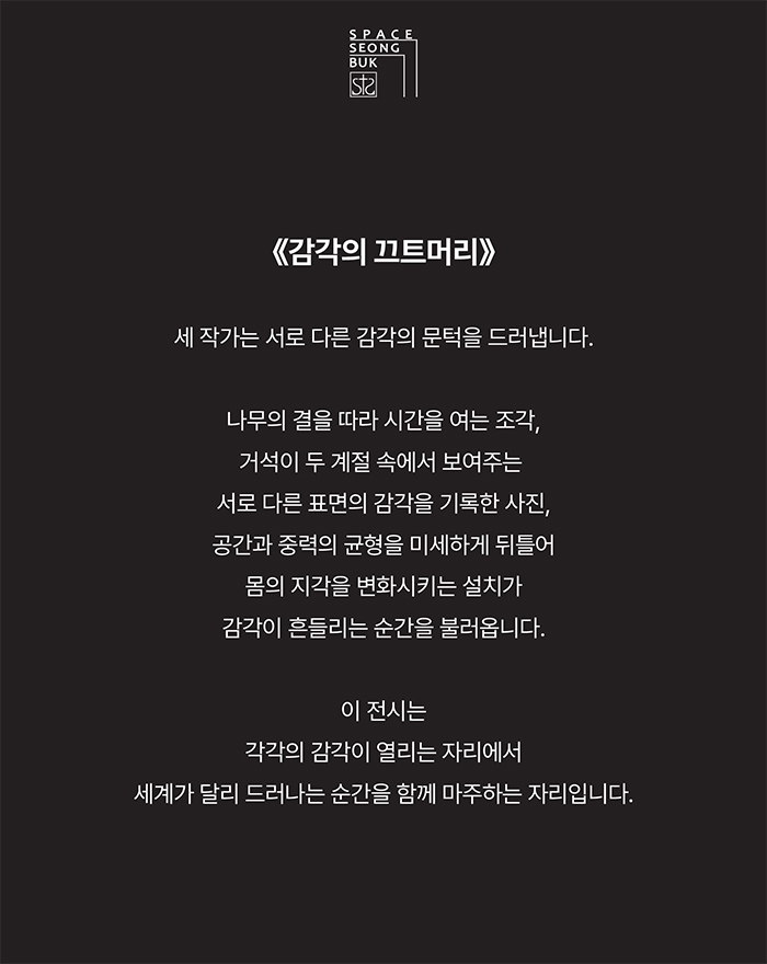 스페이스 성북은 2026년 2월, 서로 다른 감각적 방식으로 세계의 가장자리를 포착하는 세 명의 작가를 초대하여 《감각의 끄트머리 – 보이지 않는 감각의 문턱》을 개최한다.