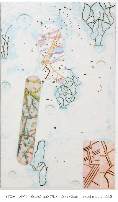 그래서 작품의 구상을 위해 멀리 좋은 풍경을 찾아다닐 필요성을 못 느낀다. 바로 옆에 있는 일상의 쓰레기더미에서도 그 자체의 조형미와 생명을 찾아낸다. 그리고 그것을 자신만의 방식대로 화면에 새롭게 구성한다. 그것을 형상을 만들어 보이기도 하고 추상적으로 표현되기도 한다. 젊은 시절 거대주제로 자신이나 세상을 향해 무언가를 던져놓고자 했던 욕망을 내려놓은 후 자신을 사물에 대입시키면서 사물의 입장이 되어 세상을 표현하는 관조의 관점으로 만들어 내는 작품이다. 김학광은 재료를 다루는 솜씨가 뛰어나 다양한 질감의 화면을 만들어 내고 있다. 물감과 석고, 제이스톤이라는 재료를 섞어 적당히 바탕을 만든 후 약 4시간 정도 경과하면 어느 정도 굳어져 초벌형태를 만들기 시작한다. 형태를 파내고 또 그 속에 나뭇가지나 자연에서 수집된 조각이나 색을 넣고 그 면을 갈고 또 다시 올리고 하는 반복 작업으로 화면은 완성된다. 그의 이런 작업은 먼저 계획되어 진행되면서 우연적이고 즉흥적인 부분도 함께 개입이 된다. 이 것이야말로 우연과 필연이 함께하는 세상의 법칙이 다. 그리고 그의 작품은 바로크를 연상시킨다. 소박한 것에서 화려함까지 다 들어 있는 리듬의 작업이다. 하나의 작은 사물은 그 자체로서의 다듬어진 힘을 가지며 화면 속에서 다른 사물과의 관계를 가지며 하나의 세계를 만들어낸다. 등장된 사물들은 음률처럼 유동적인 형태를 보인다. 작은 형태는 하나의 풀이면서 사람이기도 하다. 그것을 구별 해 나누는 것은 그렇게 큰 의미가 없다. 크게 생성의 법칙에 속한 생명체로서 하나의 풀이나 인간은 다를 바 없기 때문이다. 풀은 겨울에 죽고 봄이 되면 다시 싹이 나고 인간 역시 옛 사람의 매 순간 죽음으로 새로운 영으로 태어나는 성화된 삶을 살아간다.