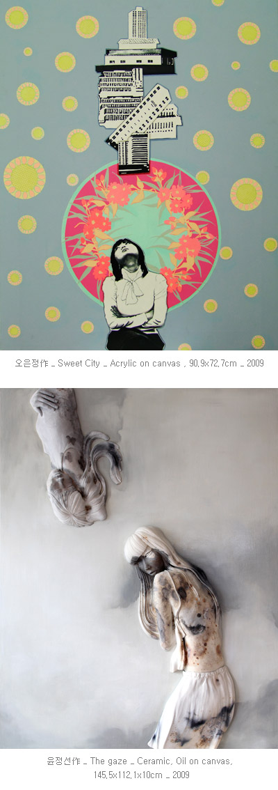오은정은 근 현대를 빠르게 겪고 있는 서울이란 대 도시에 살고 있는 작가로서 양식이 혼재된 건축물과 소비, 쾌락이란 욕망에 관한 중첩된 의식을 꼴라쥬 기법처럼 아크릴로 그린 회화작업으로 풀어내고 있다. 그의 그림은 고층건물과 한옥지붕을 가진 포스트모던 양식의 펜트하우스, 그 사이에 지친 듯 휴식을 취하는 회사원, 유행을 의미하는 같은 스타일의 여성들이 등장하고 꽃그림 벽지가 간간이 보인다. 복잡한 도시건축물사이에는 달콤한 욕망의 액체가 흐르며 벽지꼴라쥬는 행복이란 상징으로서만 존재한다. 이 그림은 완전한 회화기법으로도 표현되는데 화려한 꽃을 피우는 나무의 꼭대기에 조합된 구조의 펜트하우스가 열매처럼 달려있고 그 아래에는 젊은 여성이 불안한 자세로 앉아 있다. 그림에 등장된 인물이나 사물 모두 기호처럼 그려져 여러 가지 기표들이 모인 하나의 새로운 기의의 공간을 만들어 낸다. 오늘의 우리는 정보의 공유화로 대상화되고 규격화된 욕망을 늘 쫓아가야 될 것 같은 강박관념에 사로잡혀 있다. 그리고 줄무늬나 단색으로 처리된 배경은 감정 없는 냉혹한 사회구조의 답답함을 암시하고 기호로 가볍게 처리된 행복요소 이미지들을 더욱 신기루처럼 만들며 인물에게 미래의 불확실성까지 전달하고 있다.
