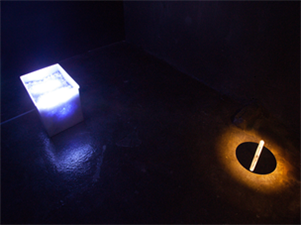 박호은, , 폴리프로필렌 박스, 세단된 백지, LED 투광등, 2016 (왼쪽)
